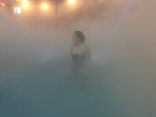 Есть подводный массаж, в кафе можно перекусить. Есть в продаже купальники и прочее. Вода прозрачная , как в стандартном бассейне, но соленая.